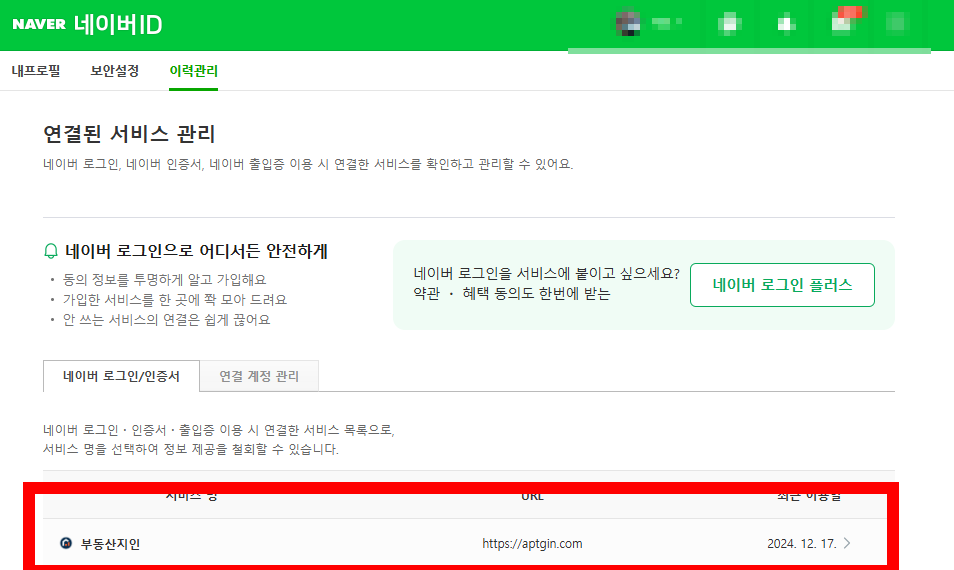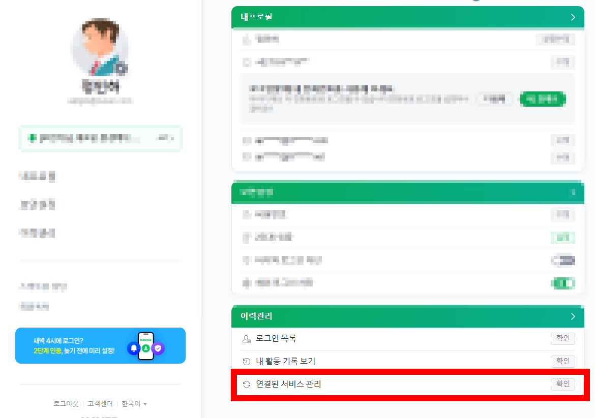2. 연결된 서비스 관리를 클릭하세요. 네이버에 간편로그인으로 가입된 정보를 모두 확인할 수 있습니다.