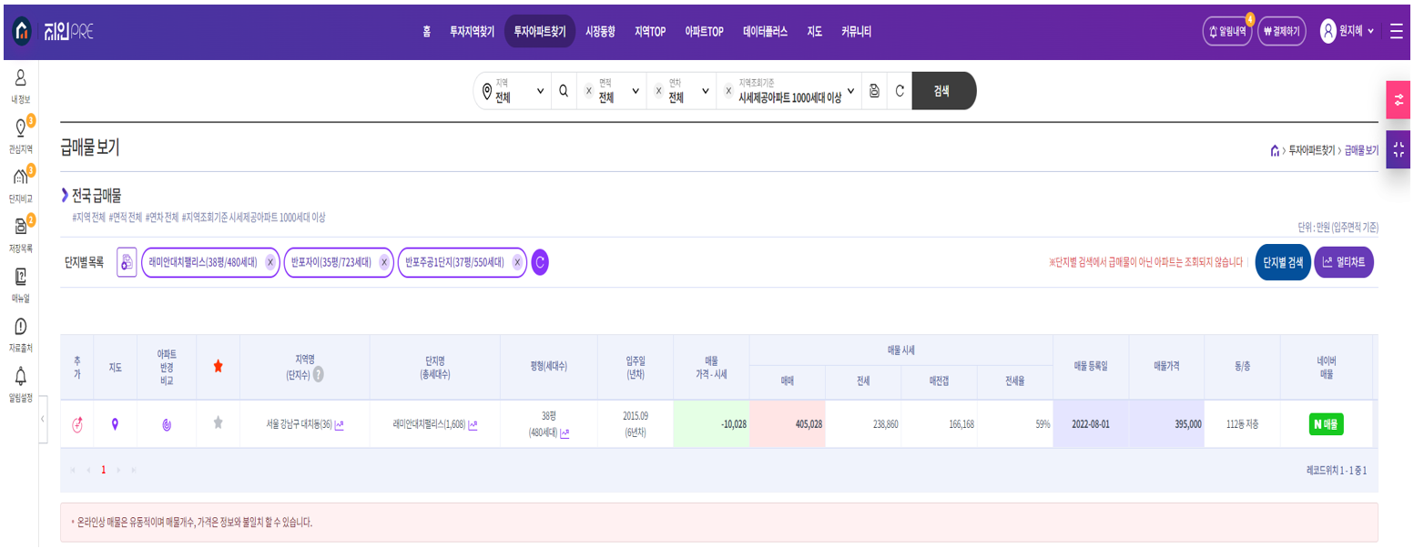 저장된 단지에 급매물이 있는지 확인할 수 있습니다
