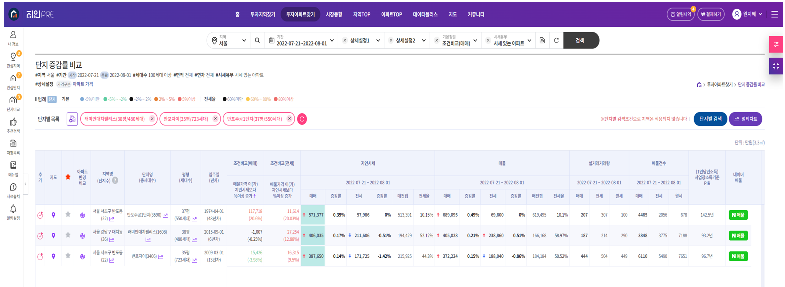 저장된 단지의 시세및 증감률, 매물정보 등을 비교할 수 있습니다