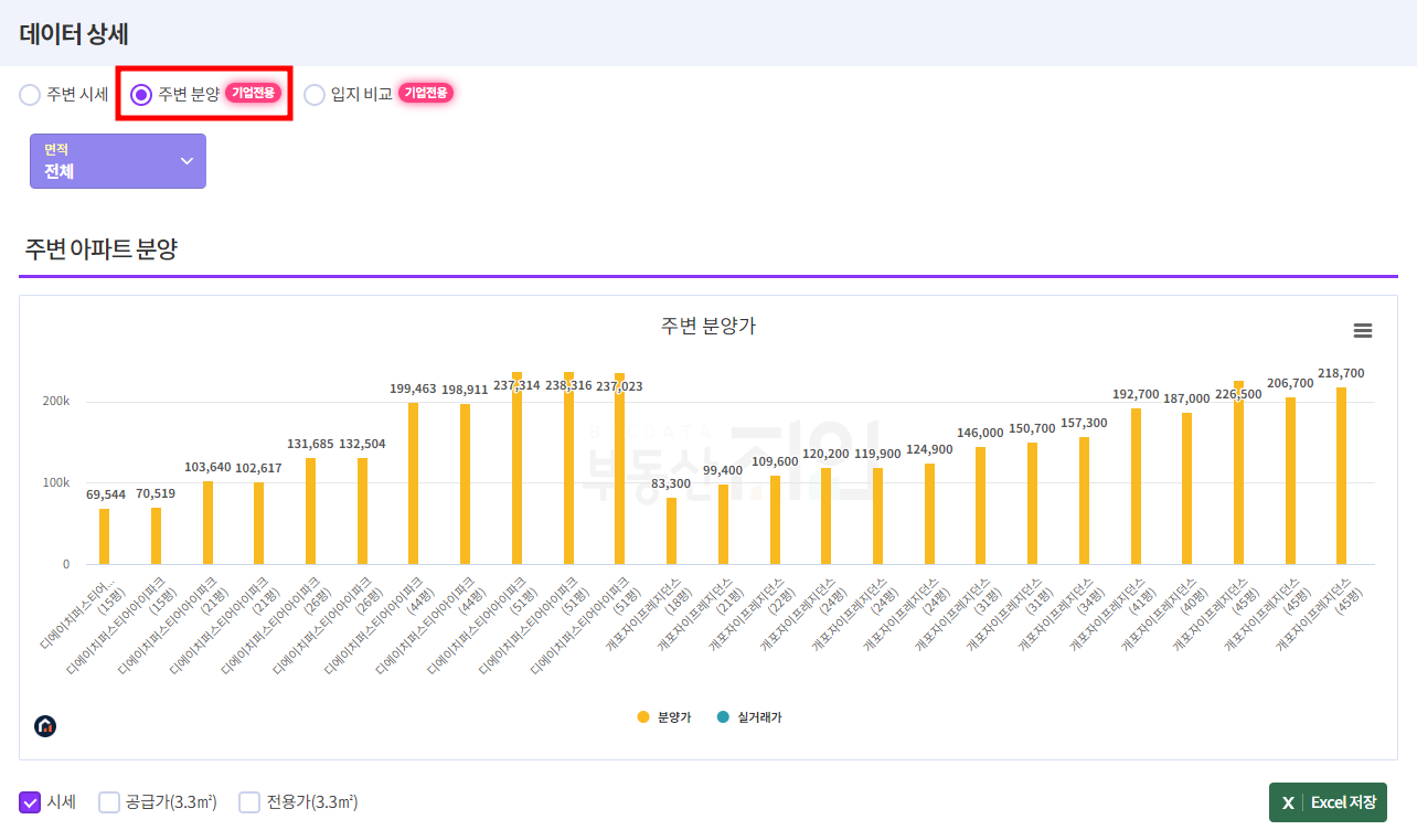 *비교 대상 리스트에서 원하는 아파트 선택 후 선택지 분석을 클릭하면 시세 및 주변에 분양하는 아파트 정보를 확인할 수 있습니다.