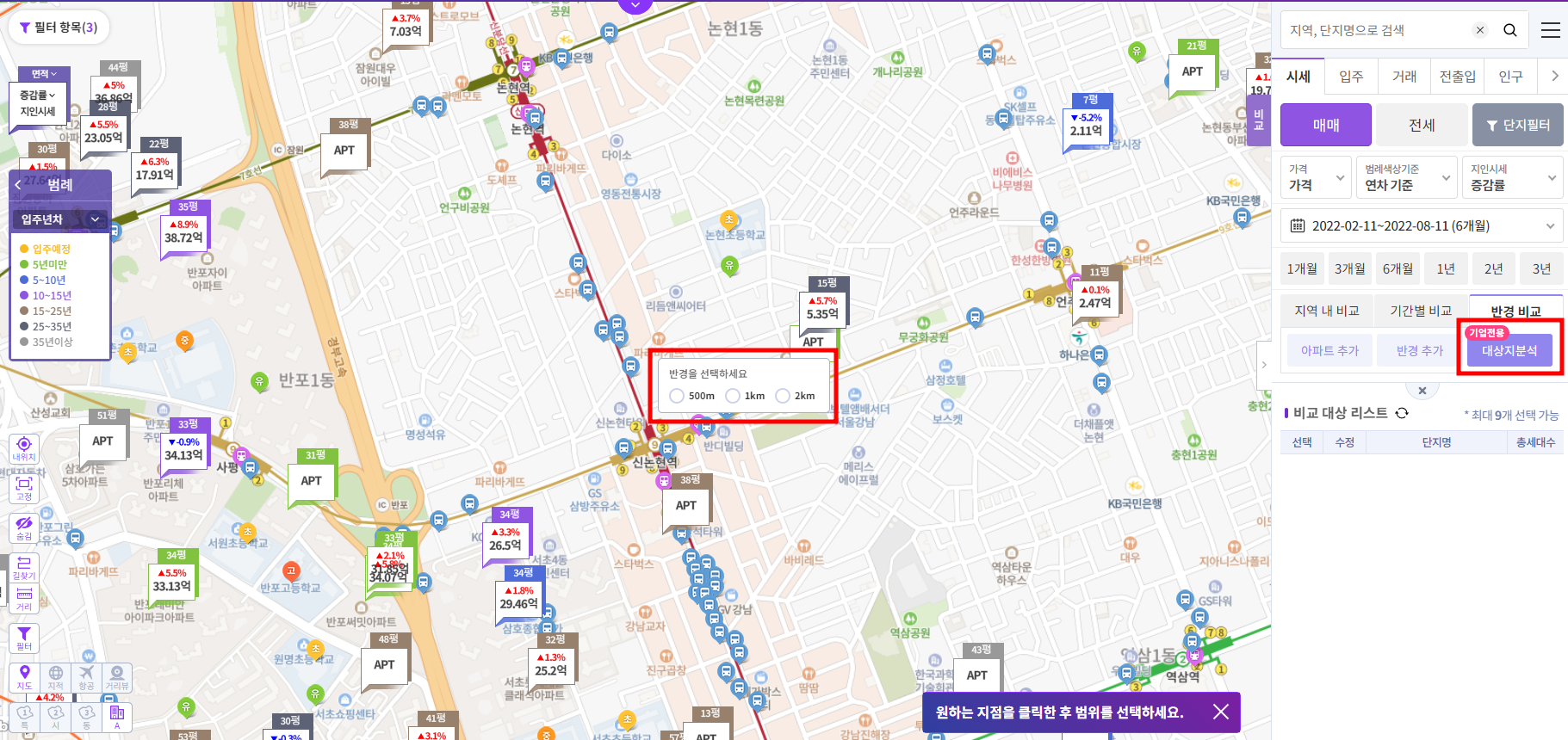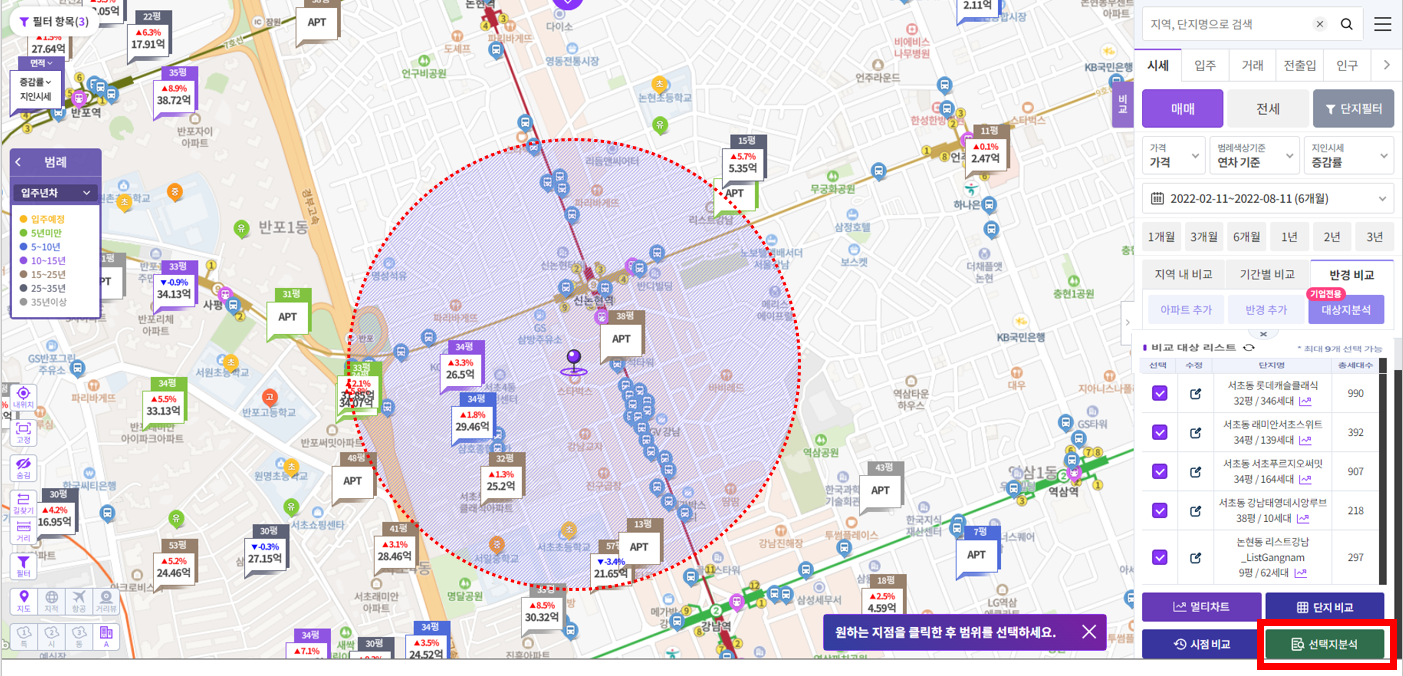 *지도에서 원하는 지점 및 반경 선택 시 비교 대상 리스트에 아파트가 자동으로 추가됩니다.