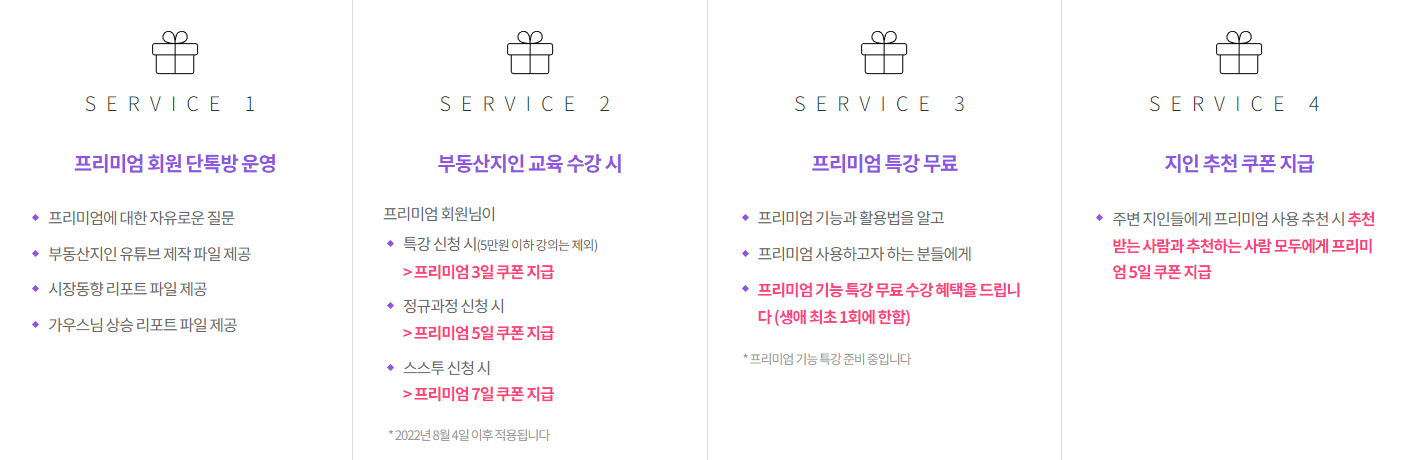 ※ 2022년 08월부터 프리미엄을 이용하시는 회원님들에게 특별한 서비스 4가지를 제공하여 드립니다.