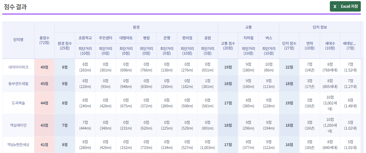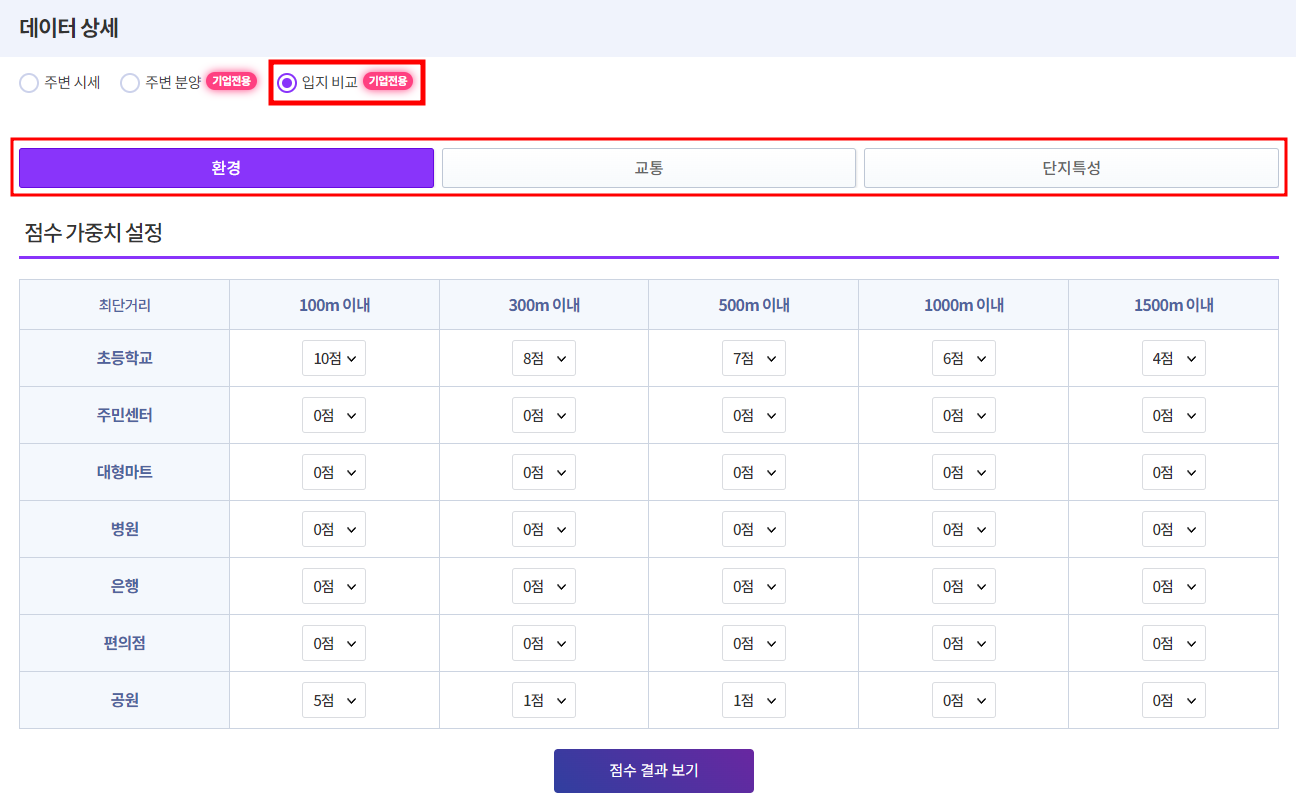 원하는 특성 (교통, 환경, 단지 정보)에 가중치를 두어 입지 점수를 계산할 수 있는 기능을 제공합니다.